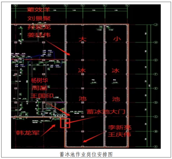 4月3日早上7点,三亚丰森劳务公司联接供冷技俩1号动力站现场负责东谈主崔玉良安排王庆伟、周磊、董效洋、刘景聚、杨树华、王国印、李某某、孙某某、姜某某9东谈主进入蓄冰池开展缔造功课,现场9东谈主共分红三个责任组:李某某、王庆伟一组在蓄冰池一里侧功课;周磊、王国印、杨树华一组在蓄冰池进口左侧功课;孙某某、姜某某、董效洋、刘景聚一组在蓄冰池的另一里侧功课。