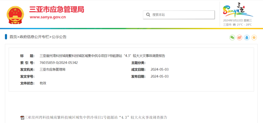 据事故走访施展,三亚崖州湾科技城南繁科技城区域联接供冷技俩1号动力站“4·3”较大失火事故,是一启事违规动火焊合维修蓄冰池侧板引燃聚脲+聚氨酯泡沫塑料保温材料,火势速即推广激勉失火,现场功课东谈主员在有限空间垂死疏散费劲且未聘请有用济急反映设施,最终导致3东谈主升天的较大分娩安全包袱事故。